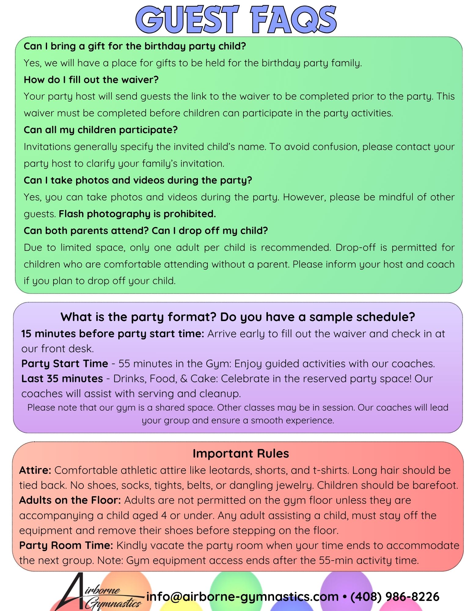 - A special gift: Every child gets a balloon, and the birthday child receives a FREE Airborne Gymnastics T-shirt!