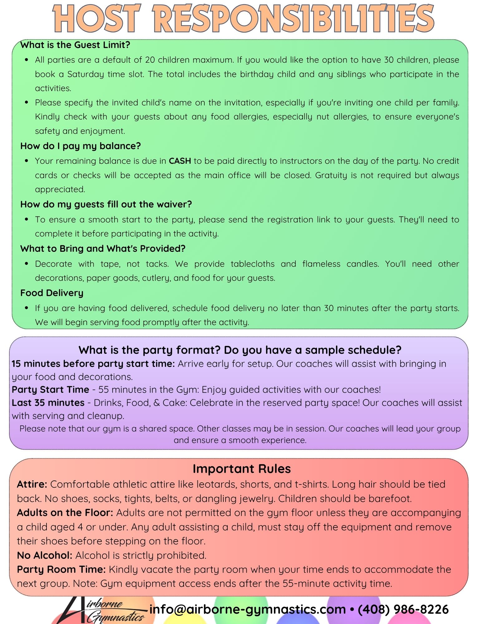 Host Arrival: Party hosts should arrive 15 minutes before the scheduled party time. Your coaches will assist in setting up your birthday party space before the activity.