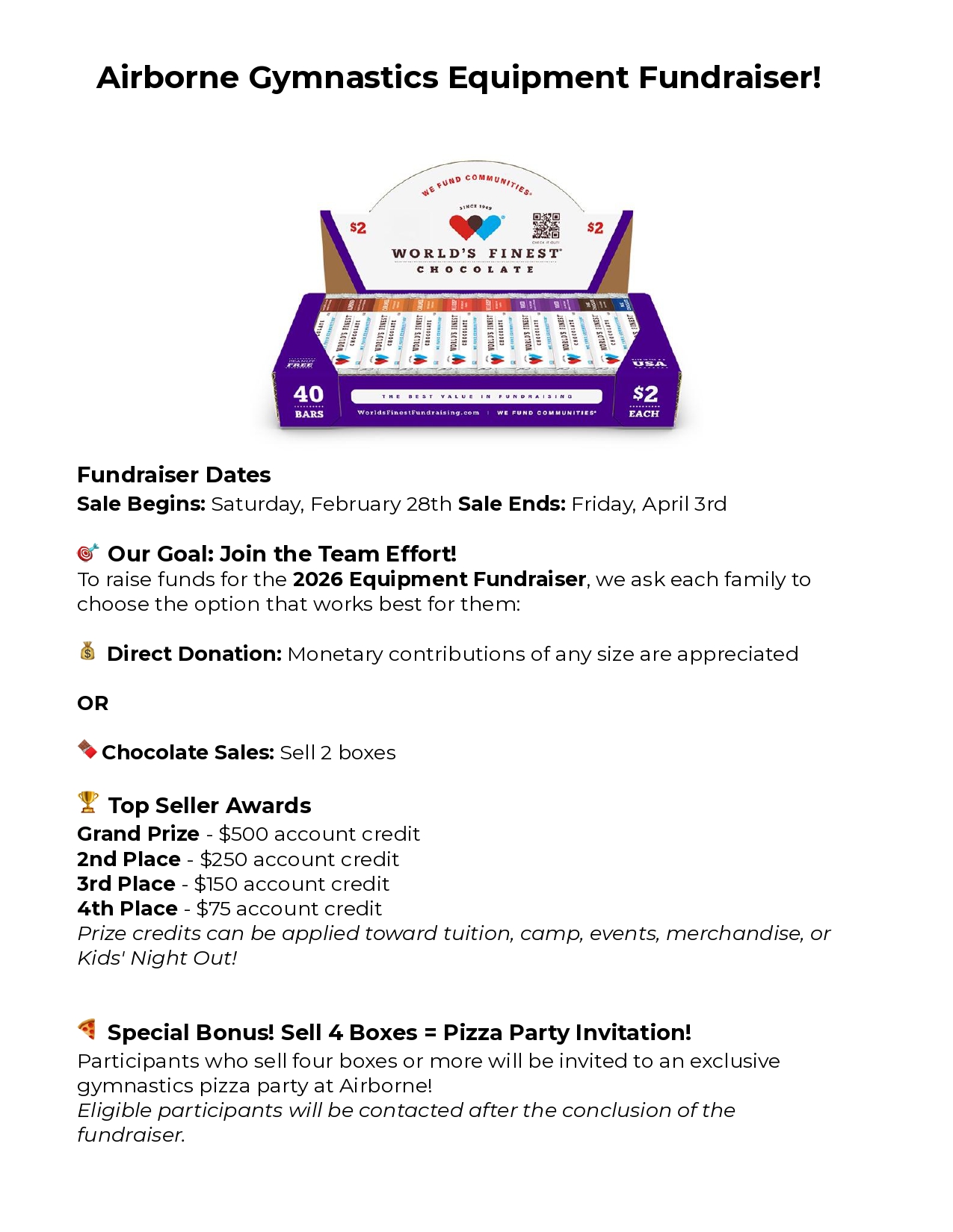 The annual chocolate sale is our major equipment fundraiser, which is essential to continuing Airborne’s vision. We want to offer the highest standard of progressive gymnastics classes with state-of-the-art equipment. Because of this vision, Airborne has been one of the most awarded competitive programs in Northern California. Our preschool, recreational, and team programs all benefit from our constant evaluation and upgrading of our equipment and facility.